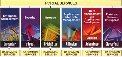 crea o nouă generație de infrastructură" - declara Kumar. Cele șase direcții Gestiune de întreprindere - Unicenter Soluțiile de management integrate în Unicenter asigură sănătatea și performanțele privind toate aspectele unei infrastructuri de eBusiness. Portofoliul de servicii oferit de Computer Associates Securitate - eTrust Stocare - BrightStor Gestiunea ciclului de viață al aplicațiilor - AllFusion Gestiunea datelor și Dezvoltarea aplicațiilor - Jasmine și Advantage Portal și Inteligența afacerii - CleverPath Soluțiile CleverPath realizează distribuția informațiilor potrivite persoanelor potrivite, la momentul potrivit, în mod personalizat. Dincolo de puterea serviciilor oferite, soluțiile CA se caracterizează prin