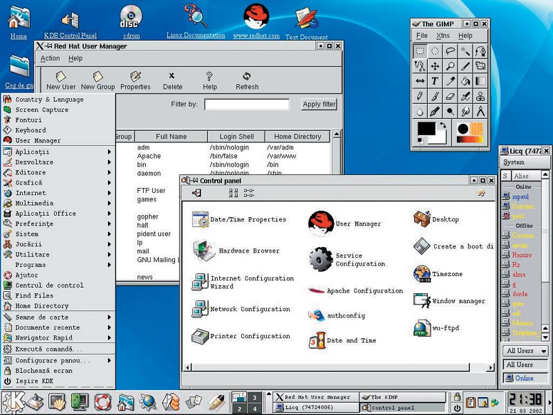 aici fiind instalate managerele grafice KDE și Gnome, navigatoarele de web Netscape,