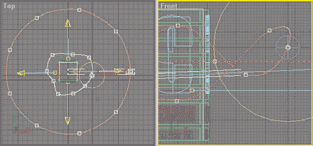 În pasul următor se creează traiectoriile după care se vor mișca lumina Omni și Camera. Astfel, se desenează două cercuri concentrice ([Create] -> [Shapes] -> [Splines] -> [Circle]), cu centrul în interiorul paralelipipedului, în punctul de intersecție (aproximativ) al diagonalelor sale. Razele celor două cercuri diferă în funcție de distanțele la care se află lumina și camera. Evident, raza cercului pe care se va mișca lumina va fi mai mică, deoarece aceasta se află poziționată între cameră și paralelipiped.