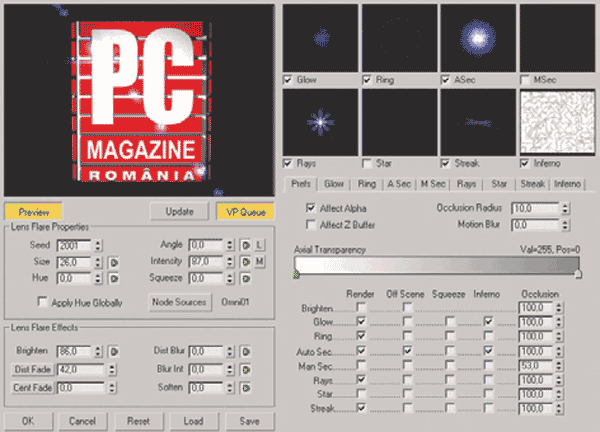 Efectul Lens Flare oferă luminii un aspect special, pe baza setărilor unor sub-efecte ce se completează și cumulează, astfel: în zona Prefs se bifează sub-efectele Glow (Render și Inferno), Ring (Render), Auto Sec (Render, Off Scene și Inferno), Rays (Render) și Streak (Render). Fiecare sub-efect are propriile opțiuni și setări:
